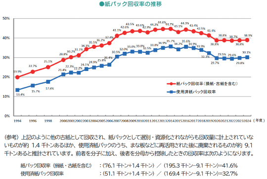 2024年度の紙パック回収率(損紙・古紙を含む)は38.9%でした。
