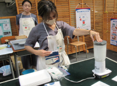 プログラムは小学生と保護者を対象として、牛乳パックン探検隊の動画視聴、紙パックリサイクルのパネルやサンプルの展示、紙パックから作られた「ぬり絵うちわ」へのぬり絵、紙パック由来の再生パルプを材料としたオリジナル手すきはがき作りなど、1回・1時間で9組ずつ、2回に分けて行いました。動画視聴の後、紙パックからパルプを取り出す工程も実際に体験していただきました。参加者全員で、予め熱水に浸漬し水分を含んで軟らかくなった紙パックの表裏ポリエチレンフィルムを端部から剥がし、取り出した紙を細かく千切り、合計2台のミキサーで水700mlを加えて3分間攪拌してパルプ液を作成しました。印刷された紙パックから真っ白なパルプ液ができるところを歓声とともに、熱心に観察してもらいました。手すきはがき作りでは、先程自ら作成したものも加えられた混合液からパルプをすき網ですくい上げた後、水分を取り除いてはがきに仕上げていく工程を体験してもらい、完成したはがきを手にした児童は、うれしそうなようすで保護者のカメラにポーズをとっていました。手すきはがきの待ち時間には、ぬり絵に取り組んでもらい、スタッフは投げかけられた質問に回答することにより、紙パック回収の大切さを理解していただきました。-