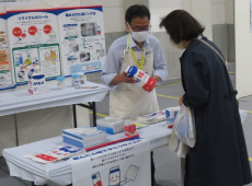 当協議会のブースでは、紙パックリサイクルに関する啓発パネルの展示のほか、紙パックの構造が分かるサンプル、紙の原料である木材チップやパルプ、再生紙工場で分離され燃料として再利用されるポリエチレン、そして最終的な再生品(トイレットペーパーなど)の実物に触れていただきました。ブースを訪れた方々には、これらのサンプルを見ていただきながら、紙パックが良質な資源に生まれ変わるプロセスを説明しました。お子様向けには啓発ノート、保護者の皆様には再生紙利用のポケットティシュを配布し、リサイクルをより身近に実感していただきました。